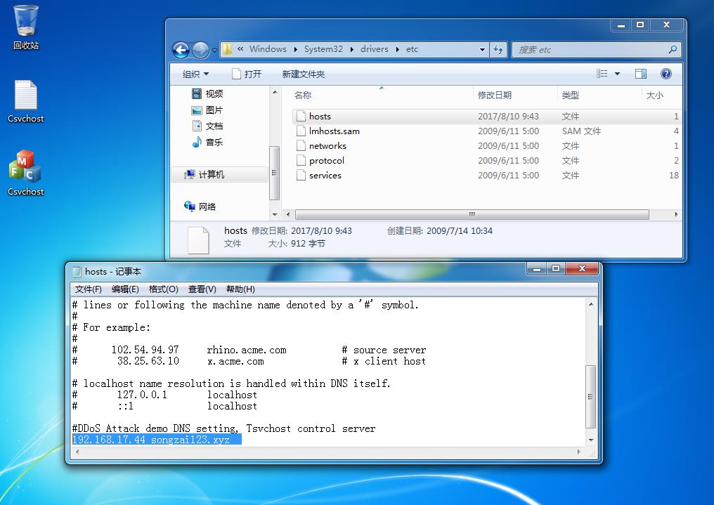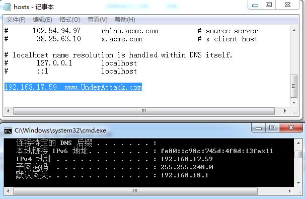 更新hosts解析文件,将如下主机解析加进hosts文件,其中“192.168.17.44”为“攻击中转控制服务器”的IP地址,更改如下图所示: