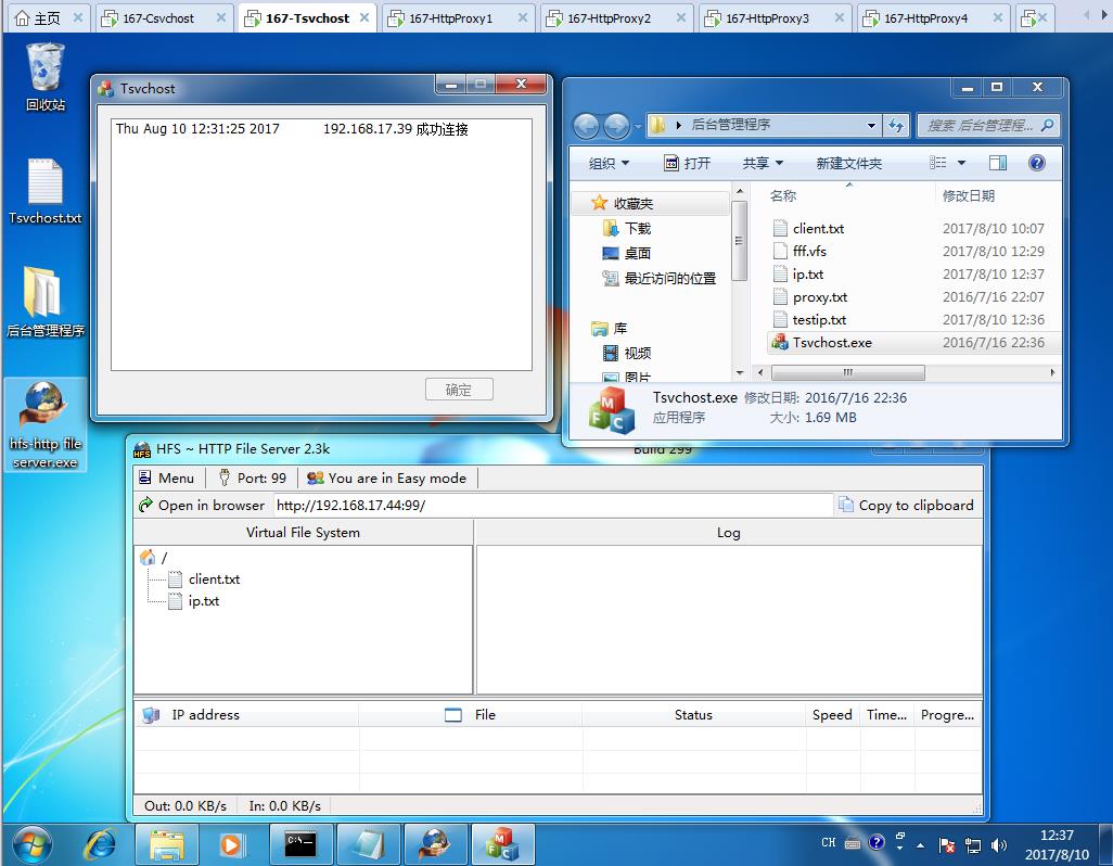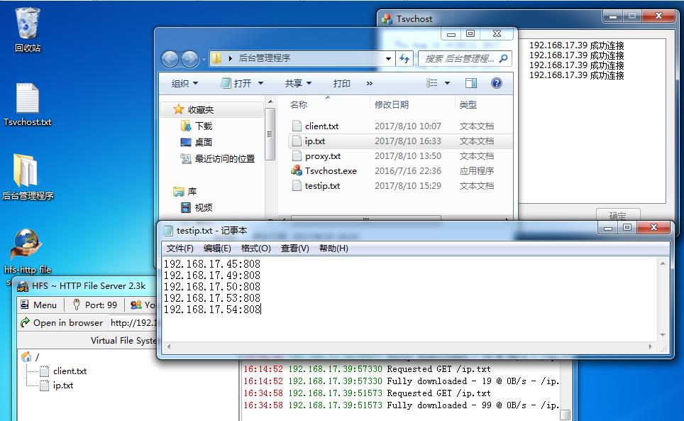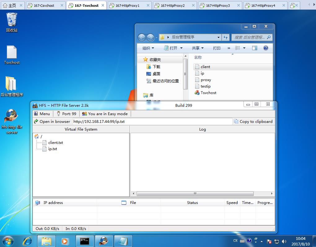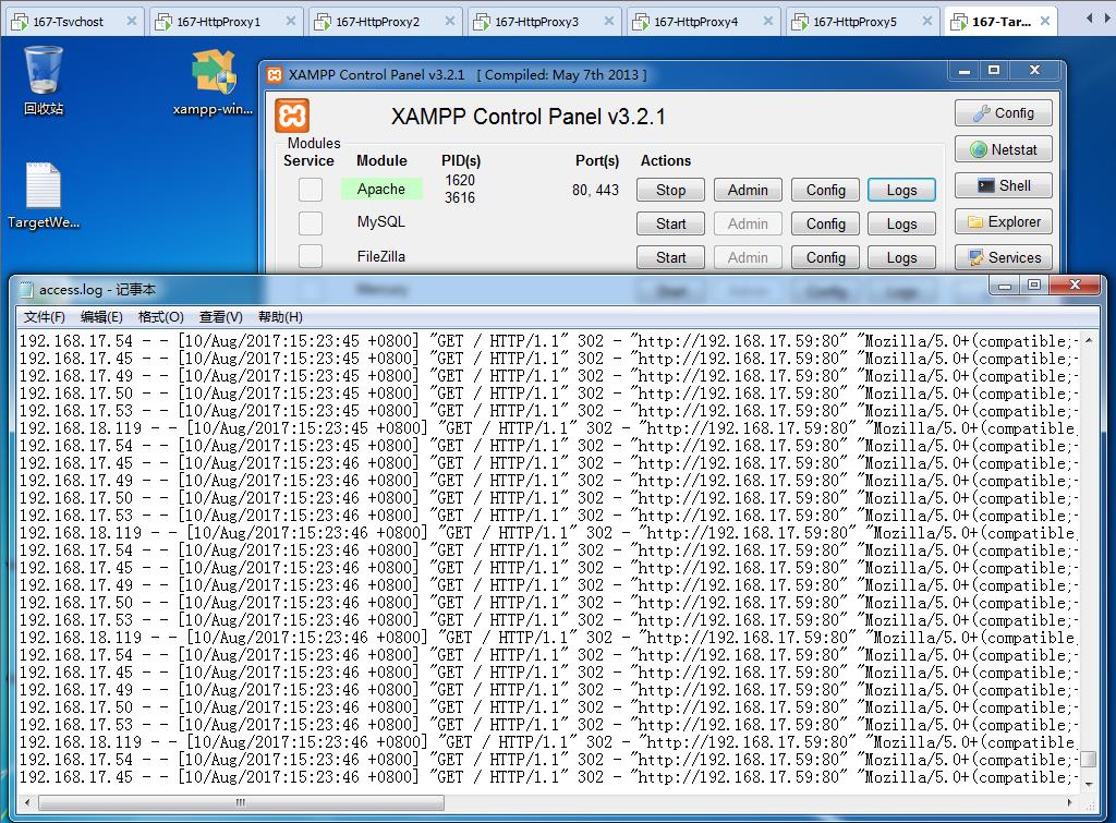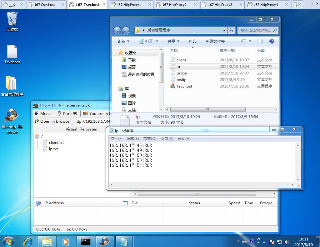 根据委托方要求对检材光盘中“攻击程序”目录下的“Csvchost.exe”和“后台管理程序”目录下的“Tsvchost.exe”进行功能分析,在“VMware Workstation”中搭建操作系统为“Windows 7 X64”的虚拟机“167-Csvchost”、“167-Tsvchost”、“167-HttpProxy1”、“167-HttpProxy2”、“167-HttpProxy3”、“167-HttpProxy4”、“167-HttpProxy5”和“167-TargetWeb”。在虚拟机“167-Csvchost”中配置运行“Csvchost.exe”攻击程序客户端,在虚拟机“167-Tsvchost”中配置运行“Tsvchost.exe”攻击中转控制服务程序,在虚拟机“167-HttpProxy1”、“167-HttpProxy2”、“167-HttpProxy3”、“167-HttpProxy4”和“167-HttpProxy5”中配置运行HTTP 808端口代理,在虚拟机“167-TargetWeb”中运行XAMPP软件搭建的WEB网站“www.UnderAttack.com”,网站IP地址为局域网地址“192.168.17.59”。经检验,攻击中转服务程序“Tsvchost.exe”提取“testip.txt”文件中的IP地址和端口信息,写入文件“ip.txt”中。“Csvchost.exe”攻击程序客户端,通过攻击中转服务程序“Tsvchost.exe”调用“ip.txt”文件中的HTTP代理服务器列表对目标服务器进行分布式拒绝服务攻击。