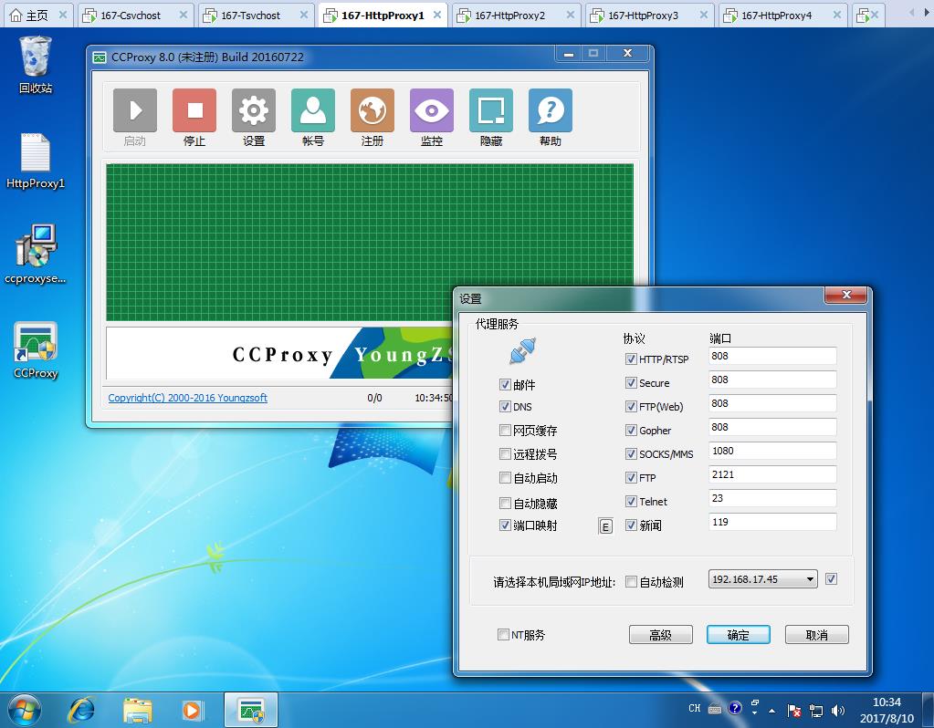 在“VMware Workstation”中的“167-HttpProxy2”、“167-HttpProxy3”、“167-HttpProxy4”和“167-HttpProxy5”四个虚拟机上依次安装配置CCProxy软件,配置HTTP代理端口为808, 四个虚拟机的IP地址依次为“192.168.17.49”、“192.168.17.50”、“192.168.17.53”和“192.168.17.54”。