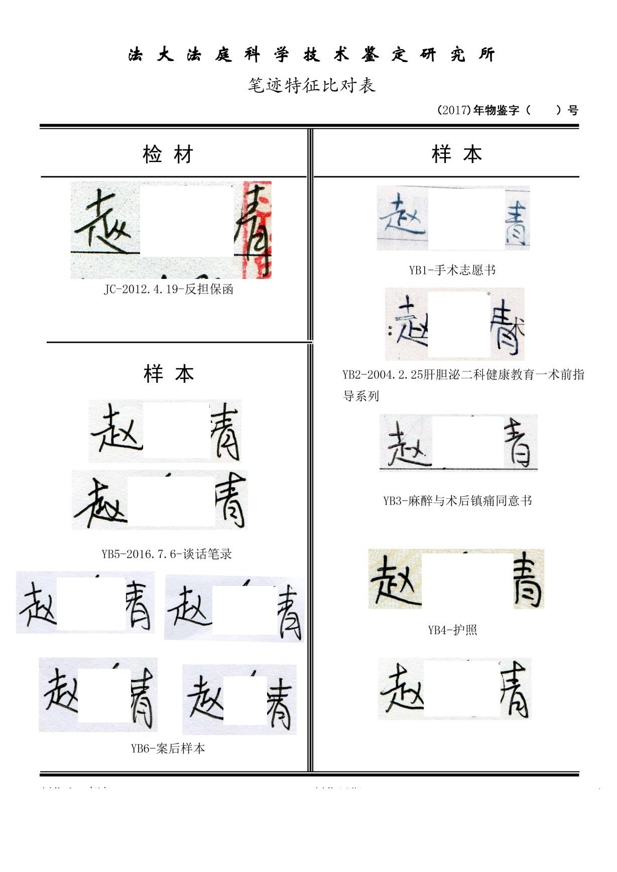 3.将检材中被鉴定的“赵某某”签名与样本中的“赵某某”签名进行比对检验,发现二者在签名的整体风貌特征,字间距,相同字及偏旁部首间的搭配比例、运笔形态及连笔动作等特征上存在差异。