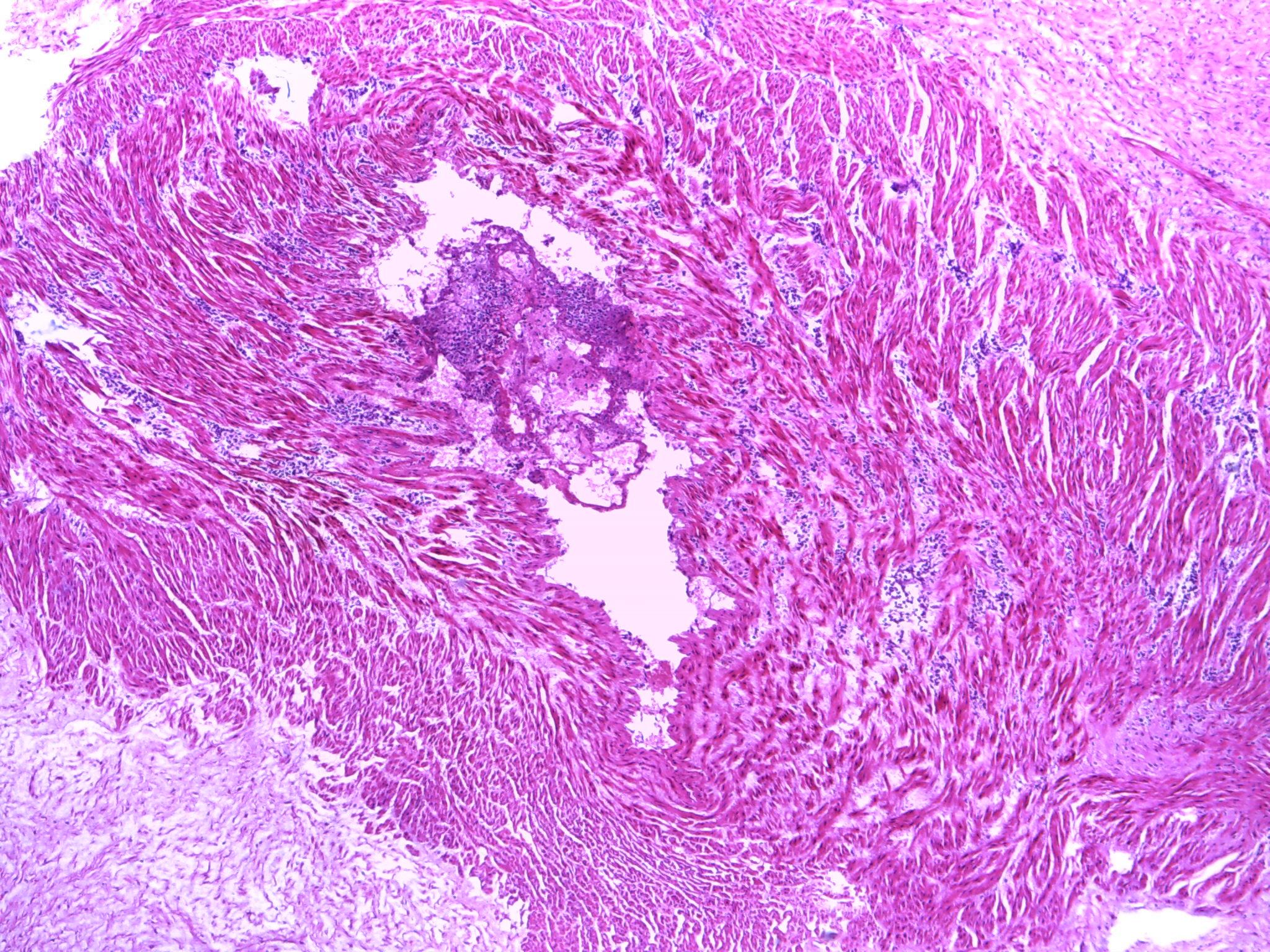 11、胎盘:成熟胎盘组织,部分绒毛变性,间质见少量纤维素坏死。部分区域胎膜羊膜下见大量炎细胞浸润,以分叶核白细胞为主,局部见坏死,脐带血管三根,局部脐动脉管壁内见散在及灶状炎细胞浸润,以分叶核白细胞为主。脐静脉淤血。