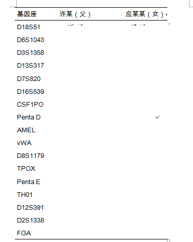附表:许某和应某某的STR基因座和Amelogenin基因座的基因分型结果(数据已做保密处理)