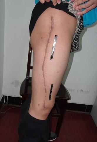 神清,轻度跛行入鉴定室。自诉右下肢比左下肢短缩,走路轻微受限。检查:颈前见一横行长4cm手术切口瘢痕,右大腿外侧见一纵向长约44.5cm的手术切口瘢痕。右下肢长度较左下肢缩短约1.5cm;右下肢行走活动轻微受限。