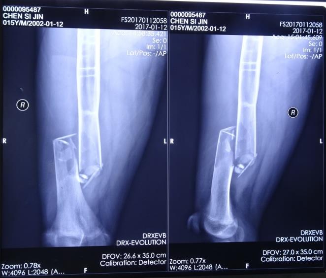 复阅十堰X医院2017年1月12日X线片(片号:FS20170112058)示:右股骨中下段骨折,右股骨中上段见横行短条状致密影,髓腔内见多发囊状低密度区,右股骨干膨胀不明显。